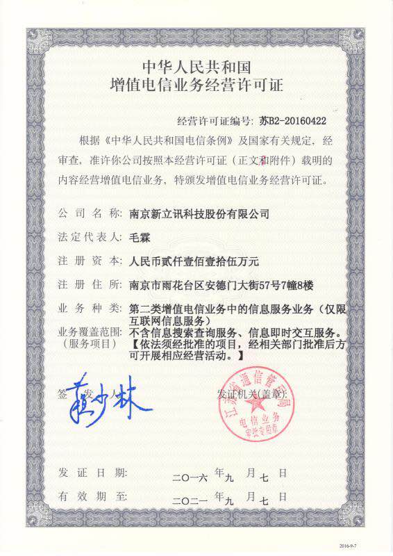新立訊喜獲由江蘇省通信管理局頒發的《中華人民共和國增值電信業務經營許可證》,這對于企業發展可謂是注入了一劑強心劑。
