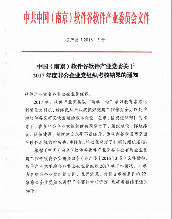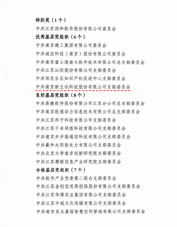 2018年5月8日,根據(jù)《中國(南京)軟件谷軟件產(chǎn)業(yè)黨委關于2017年度非公企業(yè)黨組織考核結果的通知》,中共南京新立訊科技股份有限公司支部委員會榮獲“優(yōu)秀基層黨組織”榮譽稱號。