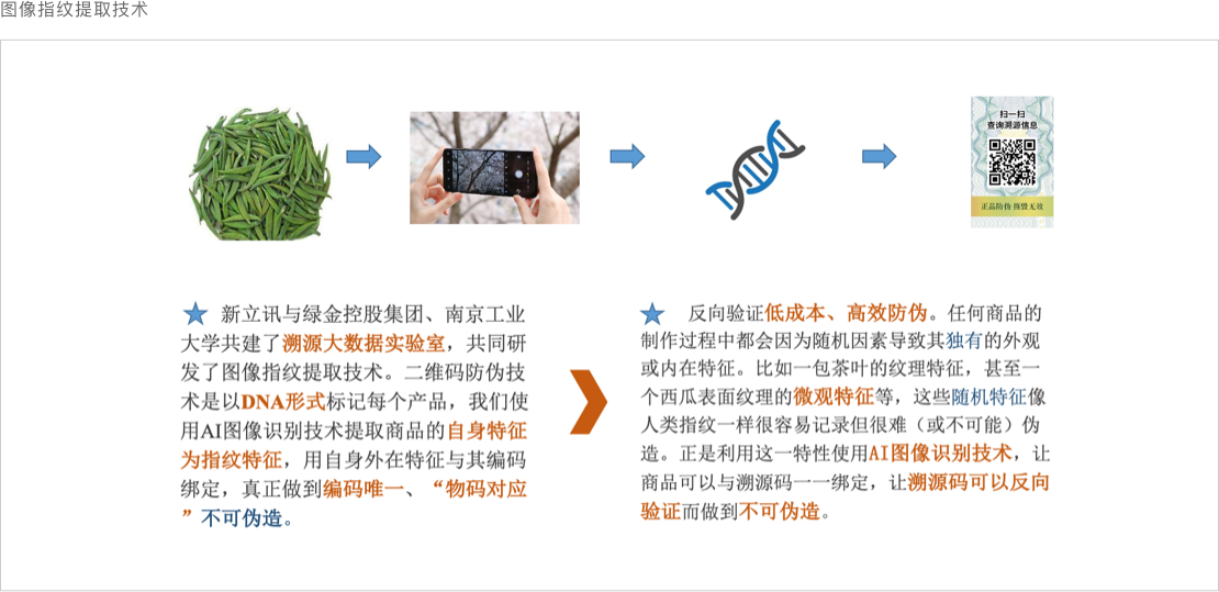 基于AI圖像識別技術,使用神經(jīng)網(wǎng)絡模型提供一套完整通用的商品指紋信息的提取和驗證方法,真正實現(xiàn)“物碼”的綁定,通過軟件精準實現(xiàn)每一個物品的追溯,真正實現(xiàn)“一物一碼”。給每一個物品一個獨一無二的“身份證”。
